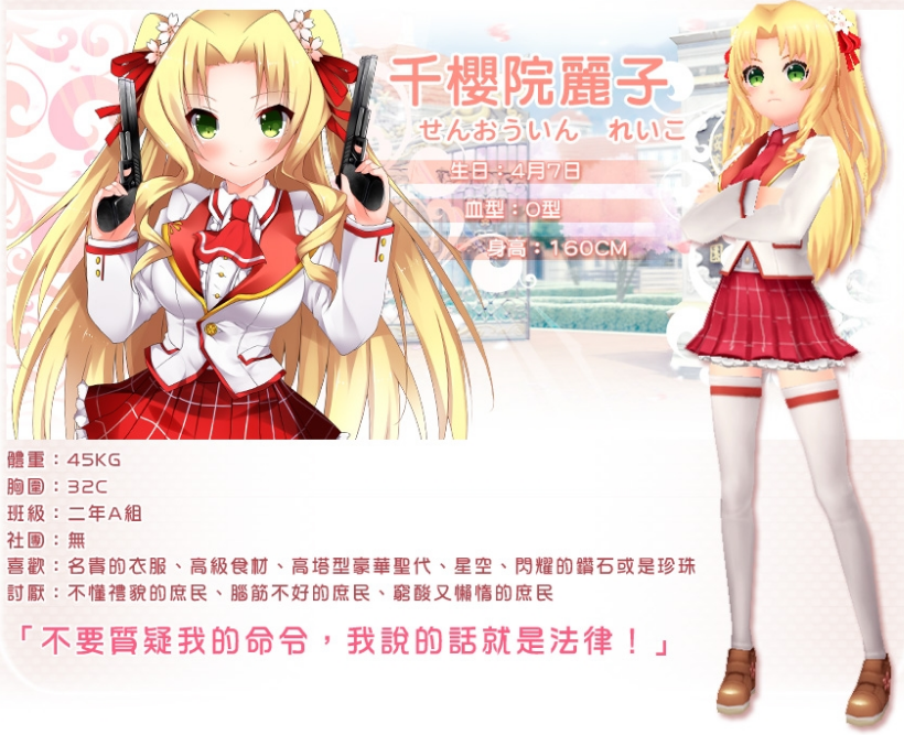 日本大财团-千樱院集团的总裁次女。金黄色及胸长髮,髮尾波浪捲,肤色白皙,鼻梁高挺,嘴唇高翘。有着高傲的个性,总是认为自己的与众不同,把异性对他的好视为理所当然。「不要质疑我的命令,我说的话就是法律!」