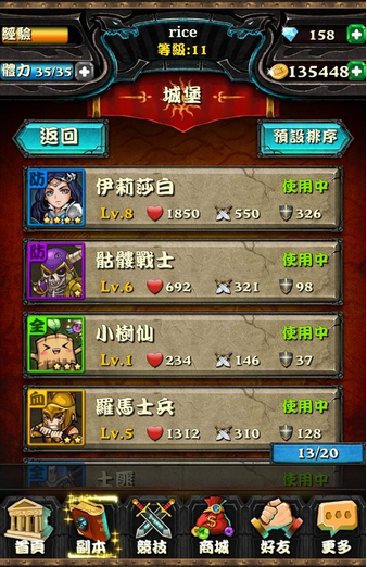 另外英雄都有其相对应的属性,分别為:蓝色(水)、红色(火)、黄色(土)、绿色(风)和紫色(雷),而剋制关系為:风->火->水->土->雷->风。顏色属性主要在消除顏色宝石时,可使所对应的顏色属性英雄怒气值提升,进而缩短英雄技能施展的时间。
