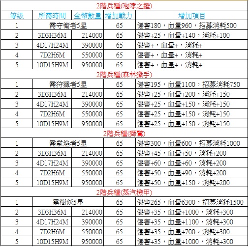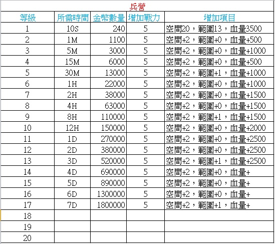 | 主堡 | 时间 | 费用 | 增加战力 | 增加项目 |
