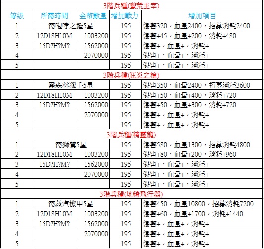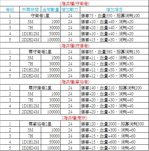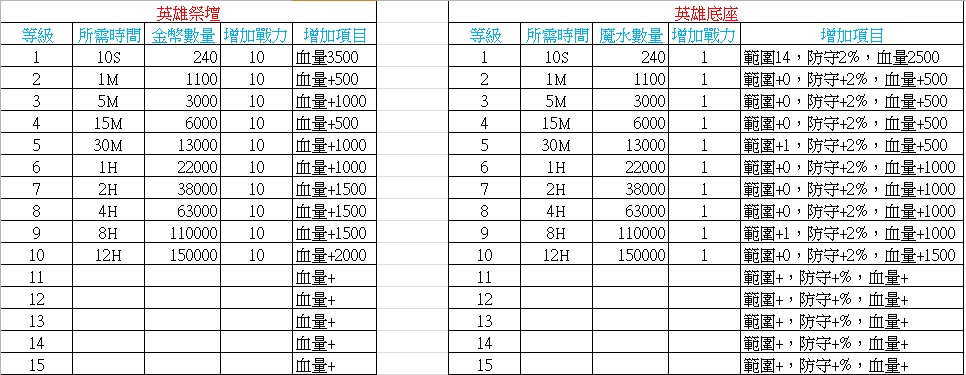 | 3 | 15min | 3000 | 兵营 1,英雄祭坛 1 (建好后可建英雄底座1) | |