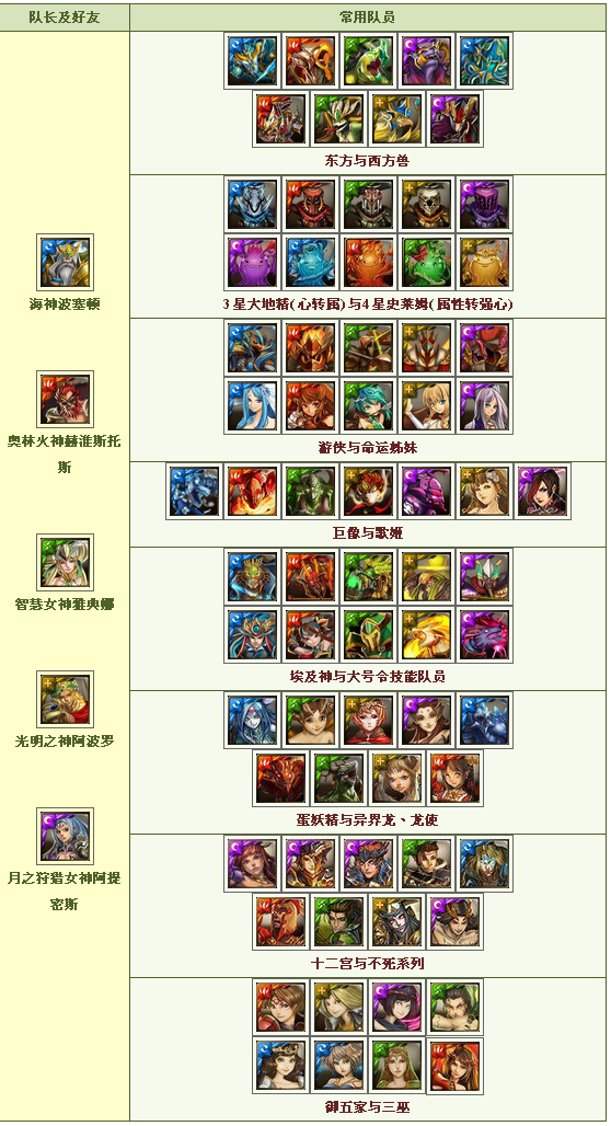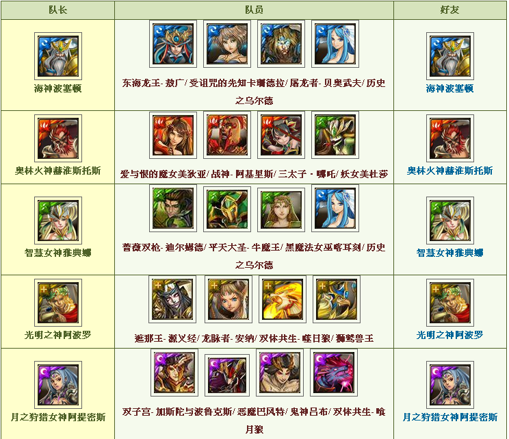 相信各位看完上述的队伍简介,眼睛已经花了!没错,上述所列的队员就是在各属性希腊队普遍的队员。基本希腊队就是双同属队长加上转珠、控制技、爆发队员,当然也是看自己要打的是什么关卡而决定队员摆设,在各队伍间,暗、水、火属性,是比较不缺乏队员,而木、光两属性,在改版后也补强一点弱势。
