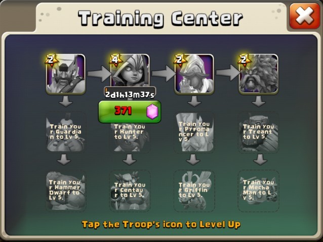 现在,我们在裡面。这是在将要升级你的部队成为平均值,精益的杀戮机器!只需轻点你想给进一步的培训升级所需的部队。首先需要解开初始的4个主要部队,你必须将它们升级到2级以解锁下一个兵种(除了树妖)。如:将守护者升级为2级,可以解锁狩猎者。狩猎者升级到2级解锁掌焰者。升级掌焰者到2级解锁树妖。