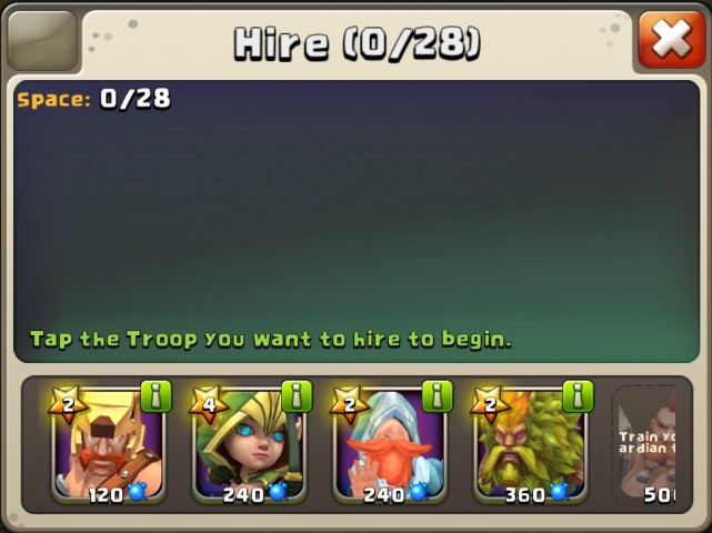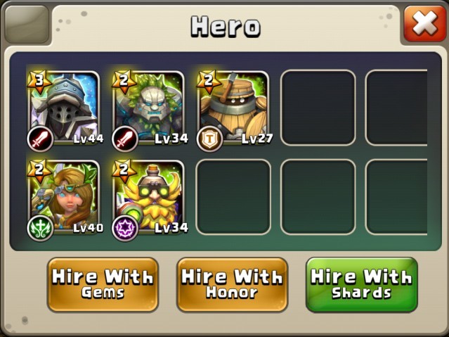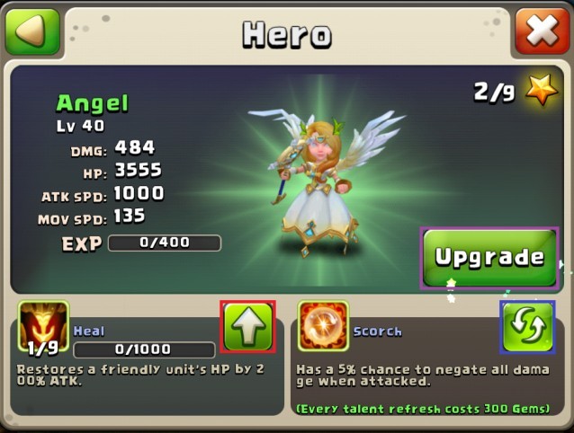 有叁个等级的英雄,普通 (绿色),精英 (蓝色)和传奇 (紫色)。部分游戏围绕英雄的使用,每个类别比以前更强。他们是游戏中非常重要的一部分。这些英雄还有很多。它们的使用类似于部队,他们的攻击,防守,但他们是远不止于此。这些英雄是特殊的。你在战斗中永远不会失去他们,你可以提升他们,培养他们。它们也可以用来在竞技场战斗中,我们之后将说到。只是有太多东西要学!让我们现在就开始吧!