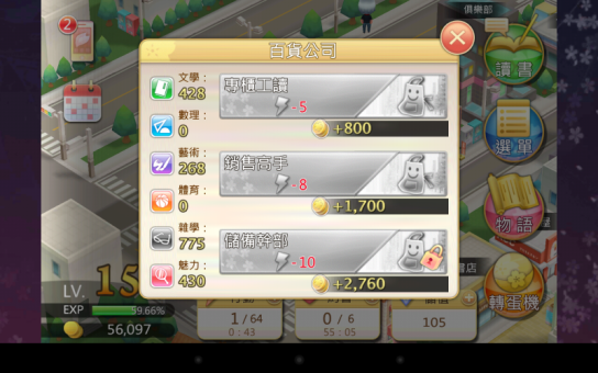 於是第二备选的百货公司就冒出来了,百货公司需要文学,杂学,魅力,这三样都是可以相辅相成的,在图书馆读书主提升文学副提升杂学,在接待会馆读书主提升魅力副提升文学,行政大楼读书主提升杂学副提升数理,虽然行政大楼的副提升数理对於打工比较冷门,但是不会扣文学和魅力就很重要了,不过依然不建议用行政大楼提升杂学,因為会扣平泽需要的艺术,而且前面已经放弃了西园寺的体育和数理。