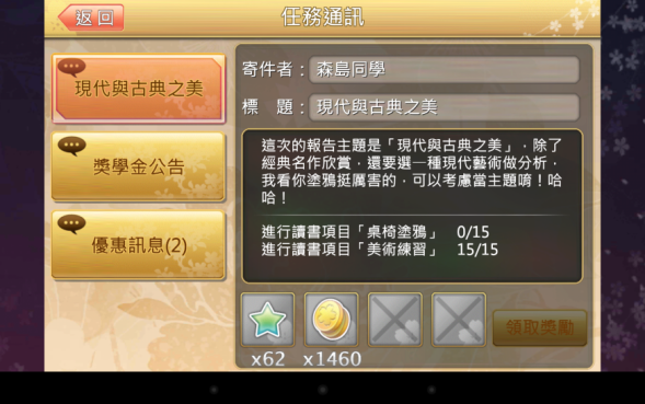给前面看出数理和体育无用性的玩家一个奖励,并且提醒你可以开始提升这两个学力了,因為社团也差不多进入瓶颈,十四级的R强化石比起前面的奖品来说价值差太多,需要的行动力也让人难以忍受。