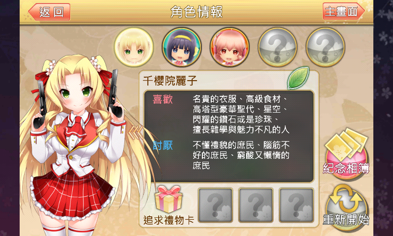 首先,情报是很重要的,追妹子前一定要先探清楚她的喜好。先到恋爱情报裡的角色情报,看清楚目标妹子喜欢的东西是什么、喜欢哪类型的男生(再哭一次,为什么一定要当男角!我想当坐拥后宫的女王不行吗QQ),否则做了白功浪费的可不只一天唷!
