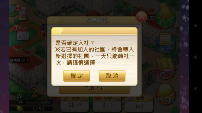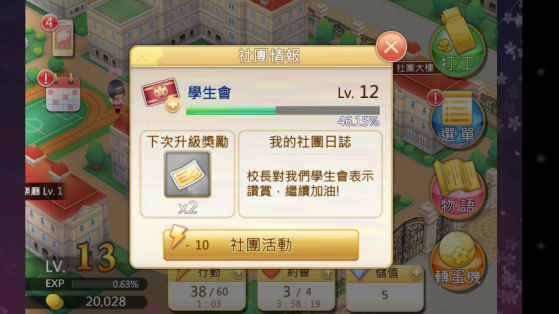 在参与社团这个部分,系统设定是可以转社(一天一次机会),转社以后塬社团的等级都还会在,但我建议选定一个社团就不要再更动了,因为扣的值会比增加的值多。以我自己加入的学生会为例,从一等升到两等,数理会+3、艺术有机会会被-5,虽然并不是每一次进行社团活动都会被扣数值,但是还是建议大家专注于单一社团就好了,以免得不偿失。