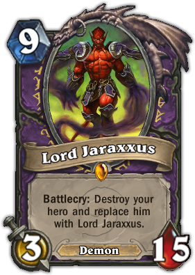 变身大领主! 血量变成15,本身英雄带有3/8 武器。英雄技能2费招换 6/6 白板怪。大家可以注意一下...这张要9费。除非你有恶魔传送门才可以马上招6/6。 所以那回合只是回血,英雄3攻。个人使用心得...这张卡在你檯面上生物与对方持平(最好有嘲讽) 或是有掌握檯面的卡片才有效果。在生命与生物差距过大时,无法帮你雪中送炭。