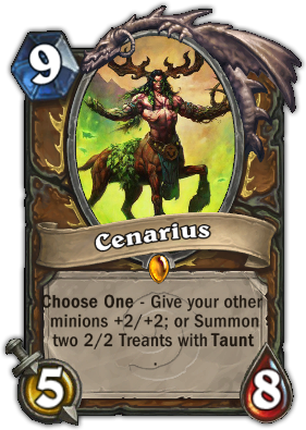 赛!赛!屎那流湿! 9费 5/8 2种效果择一 :为你其他小兵 +2/+2 or 招换2个嘲讽 2/2 树人 小逆风或是平局很棒的卡片,也能爆发。 就算死了全小怪+2/+2 & 小树人效果还是存在