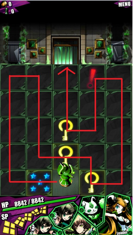 按照这个方向走,并且随时注意技能CD好没,一旦CD好就马上开,还有如果在遇到小怪后CD好了,请先开完技能在打,因为技能CD冷却除了用走格子外,你遇到小怪的次数也会算在内,也就是说,如果你在打完一波小怪后还没开技能,隔壁格子的小怪就接着攻击你,那你将浪费一回合的CD。