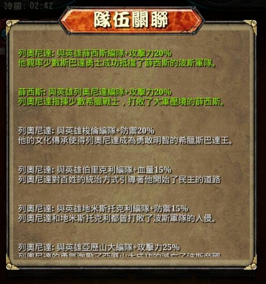 再上一张图,这张图是从游戏【主页面】--->【关联】点开的,可以看到,我同时将【薛西斯】和【列奥尼达】放在编队中,即可获得关联属性【+攻击力20%】:
