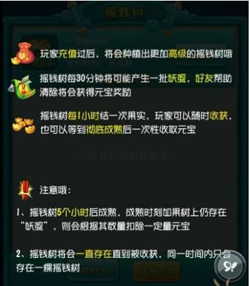 1、摇钱树5个小时后成熟,成熟时刻如果树上仍存在“妖虱”,则会根据其数量扣除一定的元宝