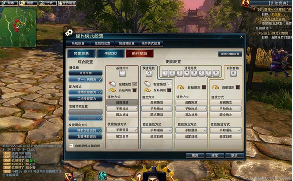就视角项目来说,游戏中可选择的就是自由视角与第一人称视角。若是选择【自由视角】,操作感觉就会类似于笑傲经典模式与传统3D 模式,这时候,无论是【左键功能设置】与【改变面向方式】都可以自由设定,且技能连放方式与技能施放方式也都能自由调整,且也可以自由勾选是否自动调整技能施放距离。但就此方式来说,除了透过滑鼠右键施展普通攻击招式之外,其他招式就得按键施展了。