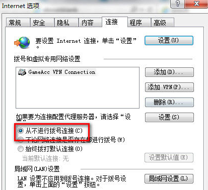 3、打开【IE浏览器】-【Internet属性】-【连接】确保选中【从不进行拨号连接】