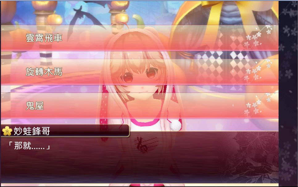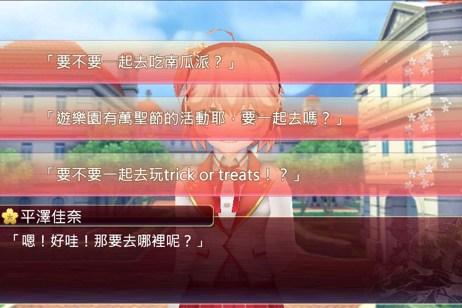 关於万圣节的邀约选项有很多种,我居然有一次全部的邀约都是万圣节相关的,实在不错,其中有两个选项比较特别,我留到最后讲,先讲按了选项马上就会影响好感度的,「万圣节快乐」「玩trick or treats」都会让好感度上升,顺带一提,我跟平泽只是很普通的朋友关系QAQ,万圣节快乐还会听到平泽说主角好可爱,果然是感觉最好攻略的角色,好像一下子就可以诱拐走了。「南瓜派」这个选项就不上不下了,果然平泽不像是个喜欢吃南瓜派的人。