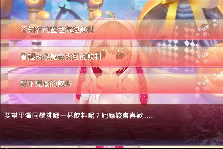 「万圣趴」的部分很简单,平泽超爱吃速食,速食都是配可乐这种气泡饮料,当然看到气泡就给他选下去就对了!大家千万不要选到最后一个,有一次我手残点到,好像是又酸又难喝的奇怪饮料,不晓得有哪位女主角会合这种口味的。