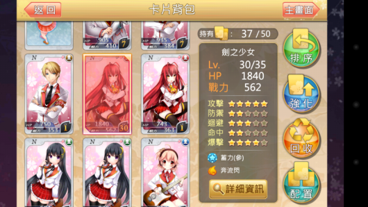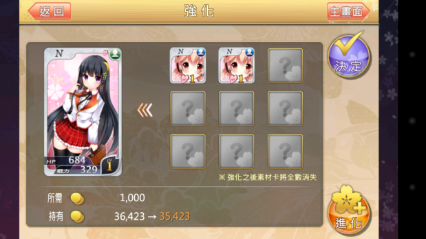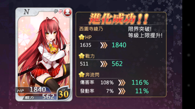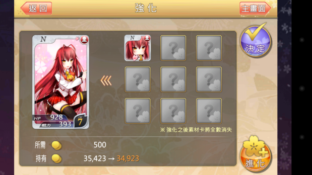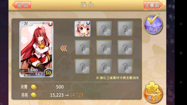接下来还有更惊人的事情,这时候我想到被强化的卡片等级越高是否带来的经验值更丰富?我用了西园寺来做实验,先拿了一张被强化过七等14%的西园寺去强化一等的西园寺,经验值只到八等62%;再拿三张一等的西园寺,以其中一张当主卡衝了两次,经验值居然达到了九等88%。也就是说等级较高的卡,带来的收穫反而更低了,因此建议大家不要拿等级较高的卡去升低等卡,效率比较低。