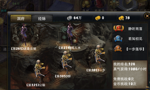 ④打通经脉进阶高等级(可以通过挑战和守护洞穴、金币购买、服用真气丹获得真气);