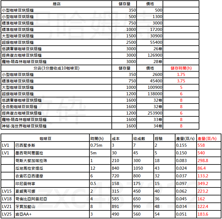 虽然板上已有许多咖啡豆效益表,但这裡还是附上一张来增加查询资料的速度及方便。为了避免误差,产量皆为无条件捨去。因烘焙咖啡豆时可获得3点经验值,且烘焙机本身就没什么经验值,所以这裡不另外计算经验收成的效益。