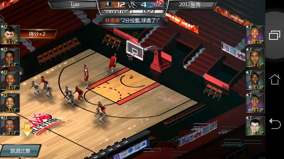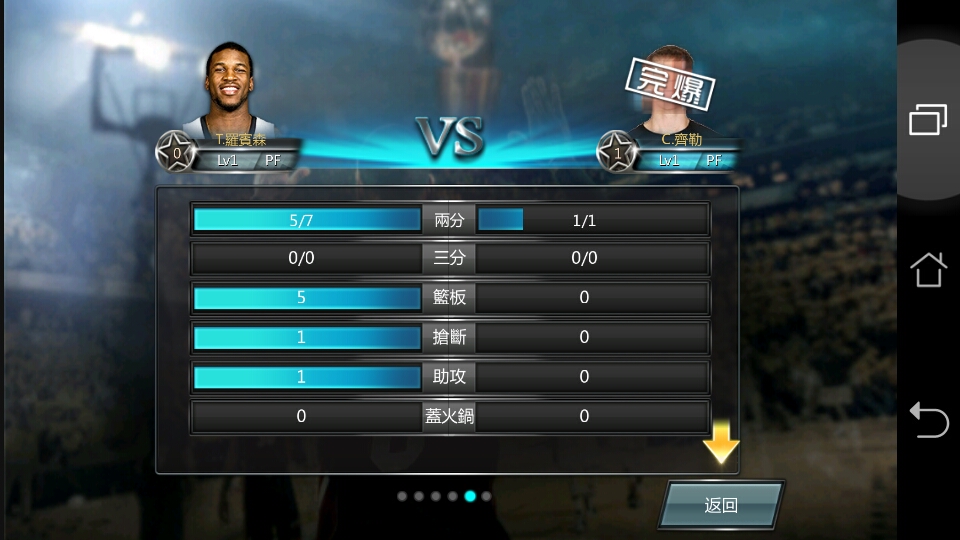 比赛结束后,你会发现它的战斗是採取『一对一』制,就是你分配的球员的位置。例如前锋,中锋,后卫。会与对手相同位置的人拼出高下,甚至比拼战积,在球场中这样的设定感觉小奇怪,毕竟我这大外行只看分数高低,和比赛输赢。