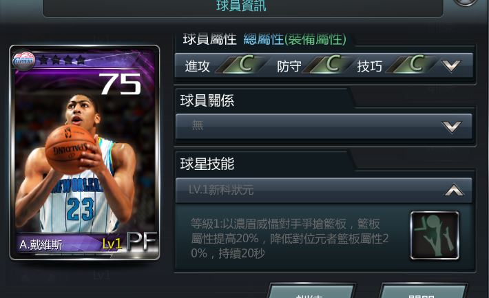 球星技能:新科状元:以浓眉威摄对手争抢篮板,篮板属性提高20%降低对位元者篮板属性20%,持续20秒。