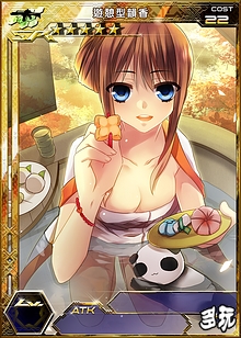 你看!妹子喂吃的给各位了,接下来给各位介绍的这位萌妹子现在正泡在温泉中等待着各位归去啊,妹子虽萌,不过COST还是有一点高啊,让人有点觉得伤,对于技能回复BC10我想很多都都不太需要,这张卡卡面虽好看却不太受用,如果没什么卡用的话也可以试试!