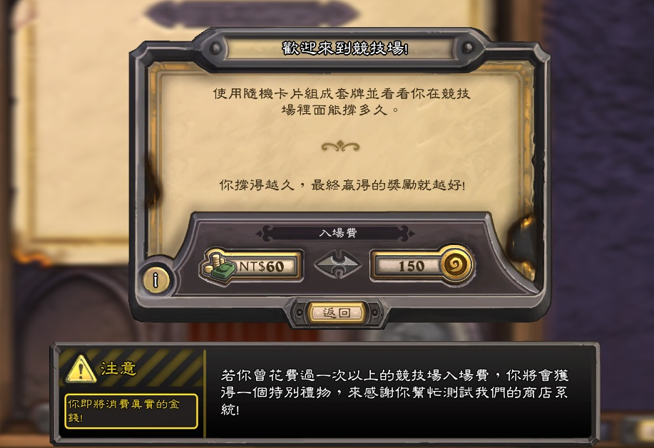 「竞技场」是《炉石战记》玩起来很有乐趣的玩法,玩家付完入场费之后(入场费150金币或60元台币,第一次进入则是免费),就会进入选牌阶段,首先要从3个职业选择一个职业,再来会根据所选择职业,继续让玩家从3张卡选择1张的动作,重覆此动作30次完后就是玩家的「竞技场套牌」(1英雄+30张卡牌,玩家比赛结束后将不会获得这些卡牌),再来玩家会配对与其他也组出「竞技场套牌」的玩家对战,玩家将可以持续对战到「获得9胜或得到3败」才会结束比赛,玩家不必持续一直游玩,可以今天打个2场对战后,明天再继续对战,比赛会依照最后玩家的胜场数多寡给予奖励,奖励有:卡包、金币、魔尘、卡片,如果实力够好的话,可以一直循环着拿奖励金币当做下场的报名费,底下将为玩家整理出实用的攻略,帮助玩家可以获得更多胜场。