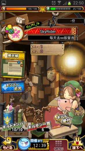 2.中间那条GUILD看版,红色部分為公会名称,而名称下面為公告跑马灯,会长可更改,下面掛的牌子显示公会等级及目前GP,公会等级目前未开放,都统一為1级,而GP部份则可透过「大狩猎」来赚取,要注意的是换公会的话GP是不会跟著走的。