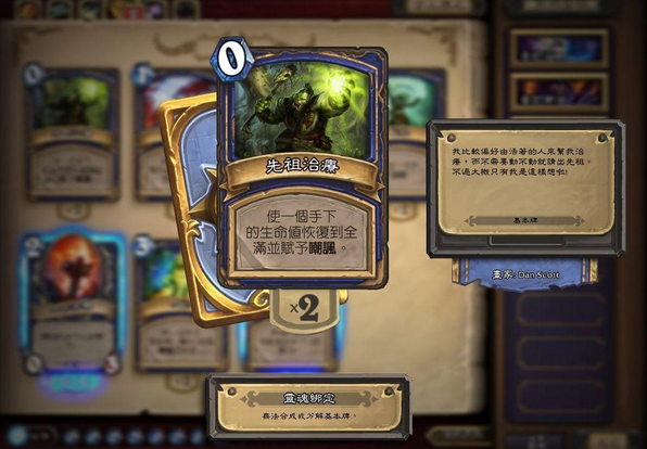 ▲「先祖治疗」是萨满相当强力的一张卡牌,除了不耗魔,还能让原本没有嘲讽能力的高阶生物转变成为我方重要的一道「防线」!