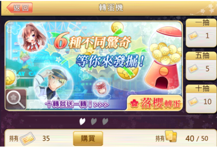 「落樱散华抄」是一款结合恋爱约会、打工经营和卡牌战斗的校园冒险AVG!卡牌在游戏中也是十分重要的元素之一,卡牌的来源除了活动送的和进行物语中获得之外,最重要的来源就是【转蛋机】。
