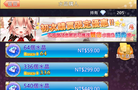 「白金转蛋」需要使用水晶才能抽卡,每次抽卡消耗150水晶,并且也有十转送一转的优惠,花费59元可以买到64水晶,却还不够抽一次,花费299元可以买到336水晶,只能够抽两次,白金转蛋有点小贵喔。