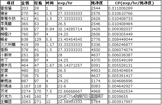CP试算表 ,这是加入纯净度考虑的表格,意外的是最划算居然是番茄酱XDD,睡前可以考虑一下蜂舍,不过这没有算到解任务的东西喔~~(鬼知道他任务会要求甚么...)