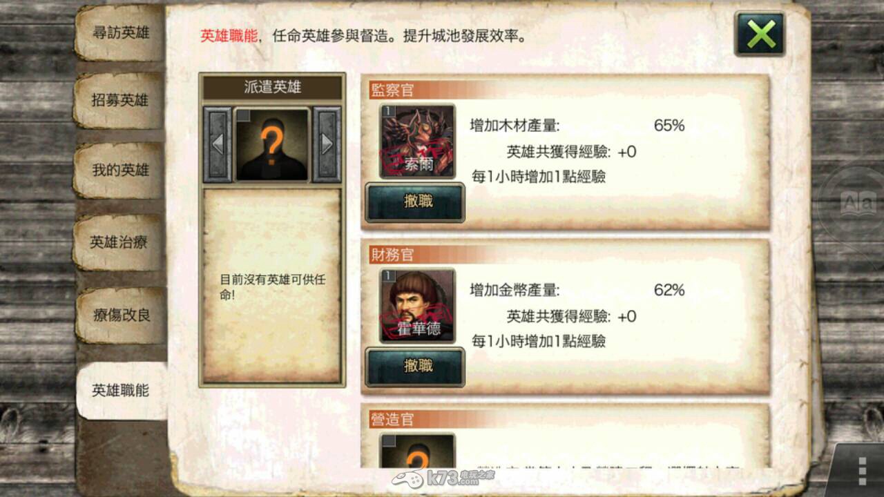 玩家可以在内政中,指派监察官、财务官、营造官等等。这些属于内政的角色当然是由玩家的英雄来执行啰!在这边建议新手玩家在”英雄充足”的情况下,来进行内政。为什么要英雄充足呢?这边先卖个关子。