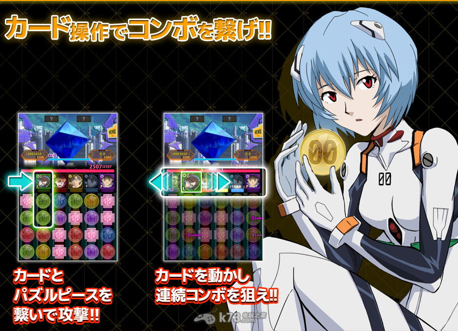 虽然《EVA:Puzzle Buster》也是玩转珠,不过系统与PAD也不尽相同,游戏独特之处在卡牌可以横向移动,与同色的珠子组合可获得更多COMBO加成! 当然,游戏最大卖点是收录新世纪福音战士(EVA)剧场版内所有的角色卡牌,加上模拟驾驶舱的转珠画面,EVA迷一定不能错过!