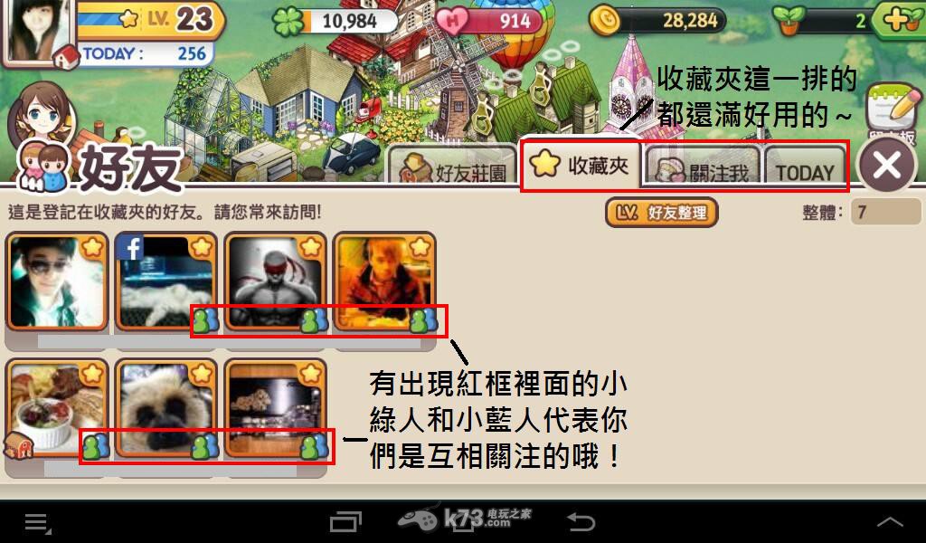 到好友家之后点击他的照片,会出现他的资料以及留言板,再来就会看到「收藏」、「删除」点了收藏之后你就会发现他的照片出现了金黄色边框和照片右上角出现星星的图案;如果你想取消他在你的收藏夹内,也是一样到他家之后打开他的资料,将收藏取消,此时你就会发现金黄色边框和星星都不见了,这表示你已经取消收藏他。小蓝人和小绿人左边如果有出现黄色的箭头,代表你还没有拜访过他哦!如果小蓝人和小绿人左边则是显示房子的图案,代表你向他发出支援了!
