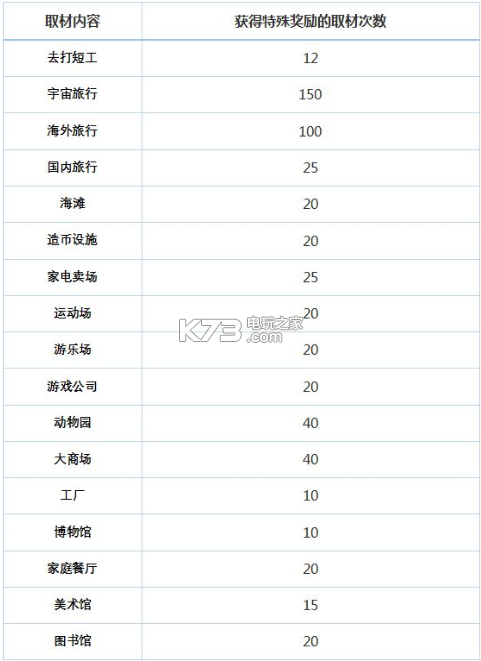 漫画道场物语游戏中让画家们外出取材达到一定次数会获得隐藏的特殊奖励,下面给玩家分享一下相关的数据,让你能更快的获得奖励不要错过哦。