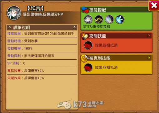 点选某项技能后,会看到以上这个画面。右边会有:此项技能应该跟哪一项技能搭配,此项技能被哪一项技能克制和技能的详细说明。大家可以仔细的看每一项技能的资讯,然后做一个属于自己的搭配。个人的建议是,搭配技能时应该排一到两个保命技能,尤其是復活真的很好用。然后剩下的就可以放一些攻击性技能,最好是一些夹带反击和追击的技能,增加攻击对方的次数。