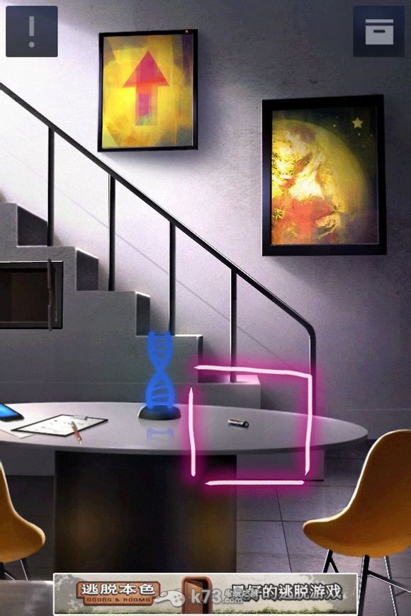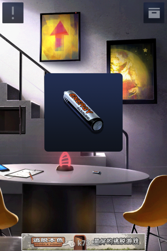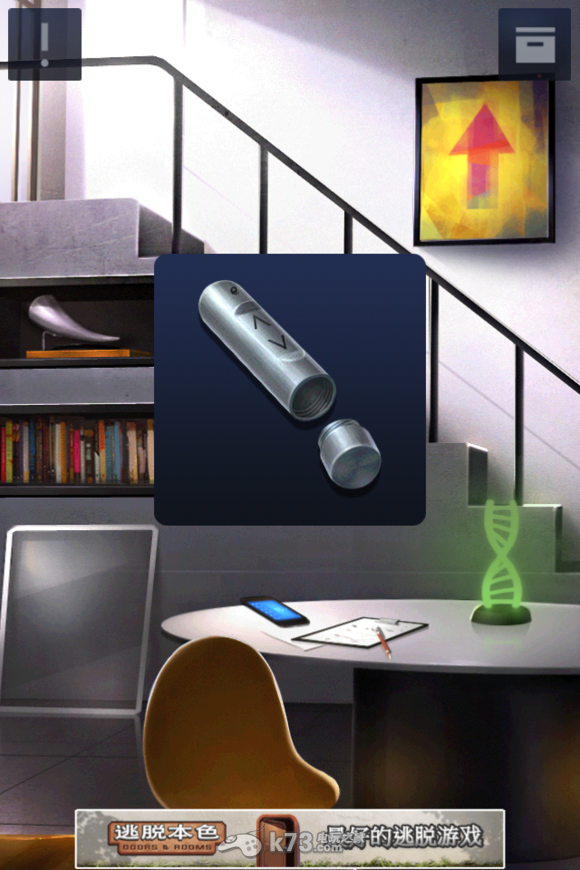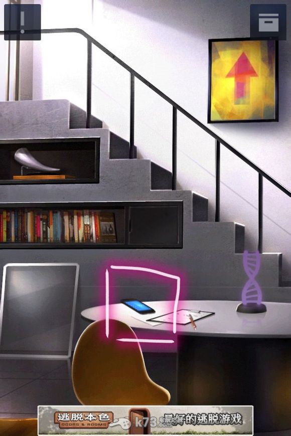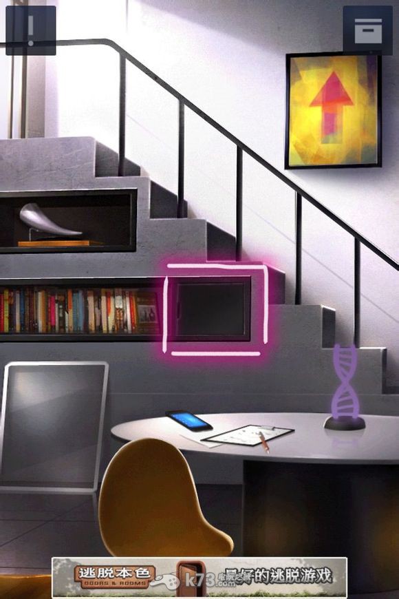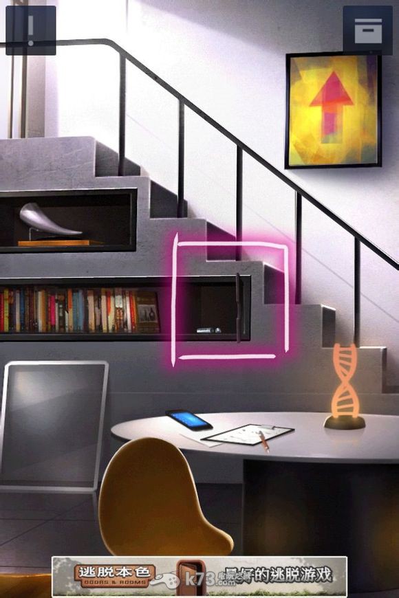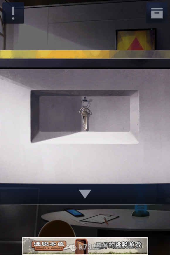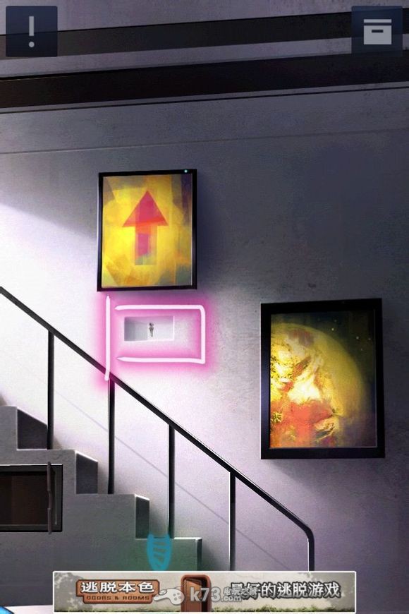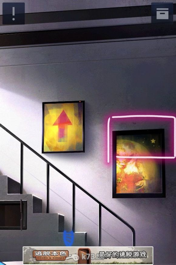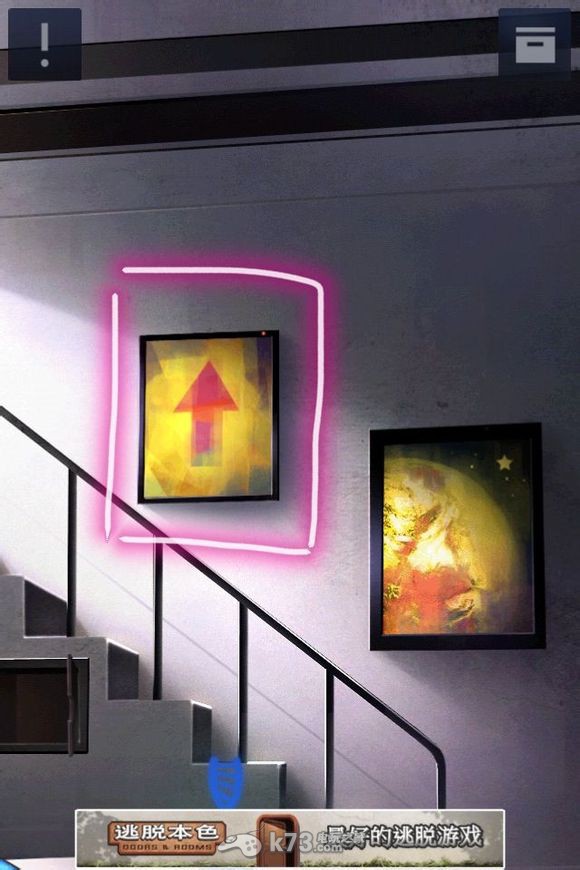 第四步,用这个激光遥控器去点击墙壁上那个带向上箭头的画,点击之后会发现那个画会向上移,然后出现一个凹槽,里面挂着钥匙,点击获取钥匙,如图: