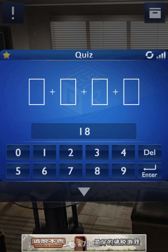然后点茶几上的手机,是Quiz,四个框即表示将门边上的四个大数字相加,得到18,输入18后拿到奖励