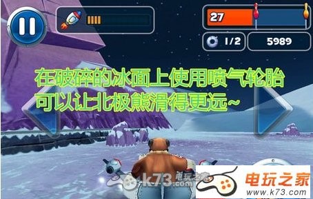游戏中要获得高分不仅要能让北极熊滑得更远,而且还需要把保龄球瓶子全部击倒才能获得更高的分数。