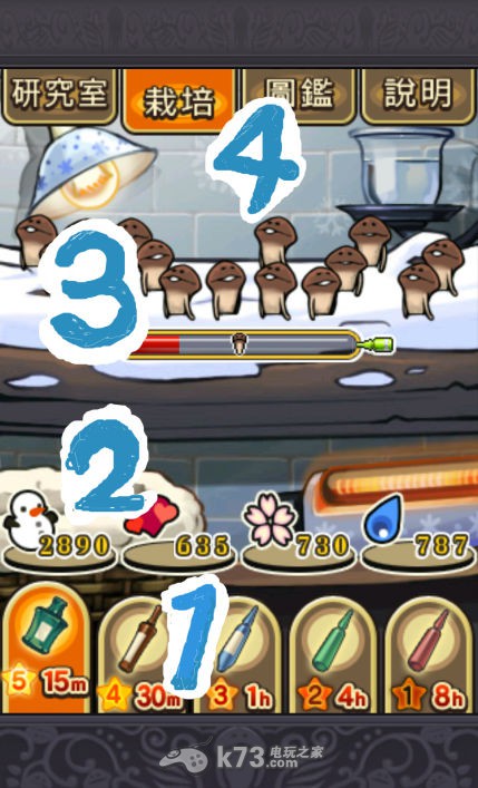 就是这款游戏的生财工具,总共有五种药剂,区分为15分、30分、1小时、4小时、8小时,每种药剂等级都不同,15分为最高星级药剂,8小时为最低等及一颗星药剂,药剂的差别就在于蘑菇的生长速度!