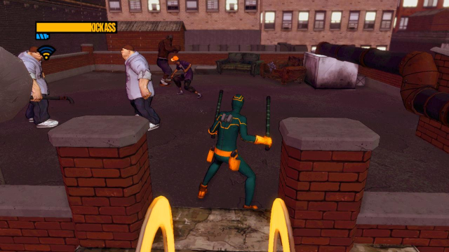 在屋顶需要面对四名敌人,其中一名胖子手持水管,先把他的武器打掉,然后以防反套路对付所有人。