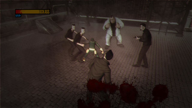step15.穿过巷子走出到马路,要对付5名敌人,其中黑色服饰的男子持有棍棒,先把他的武器打掉,然后以防范技对付他们。