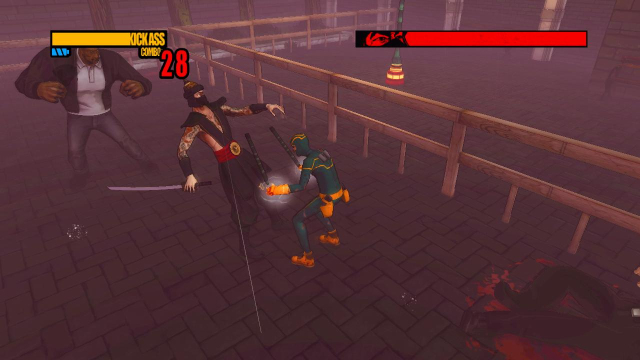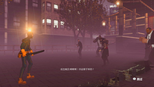 step9.来到一个有圣诞街灯的小院子内,在这要面对三名敌人,白衣的胖子和黑衣的瘦子手里都持有棍棒武器,先对付两人,将他们的武器给卸掉。