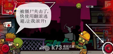 在游戏中,玩家不仅仅要杀僵尸还要懂得逃避,点击右下角的角色滚动可以多开僵尸的夹击哦!躲开僵尸之后再用枪来打。