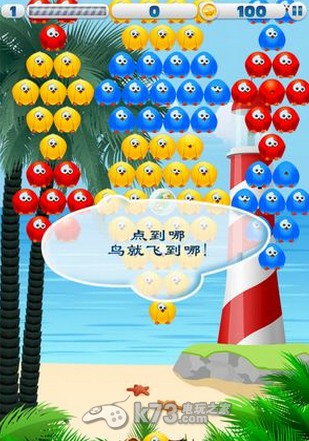 游戏操作简单,跟其他的泡泡龙游戏半斤八两,玩家只需点击屏幕中你想让小鸟飞去的地方,乖巧的小肥鸟就会自动拍打着翅膀飞过去,找到三个或者三个以上相同颜色的同类群体,便可达到消除效果,途中大家还可以利用小鸟吃到金币,赚取买道具的资本。