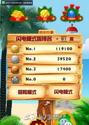 本作具备冒险和闪电两大模式,冒险模式其实也就是大家熟悉的关卡模式,玩家在完成一定的任务要求之后,便可通关解锁新的关卡;而闪电模式就有点像挑战模式了,在有限的时间内,开动脑筋、想方设法尽可能消除多的小鸟,获取高分,这是一次次跟自己比拼的过程,也可以体验到跟小伙伴们竞争的乐趣。