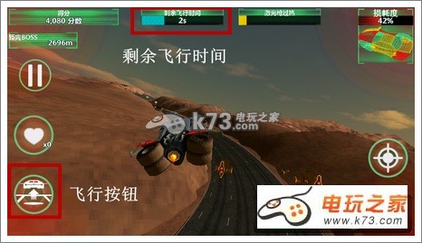 点击屏幕上左下的飞行按钮,就可以起飞了。飞车在空中的时候,一样能通过重力感应,控制飞车的飞行状态(上、下、左、右),以及用武器攻击前方的车辆。