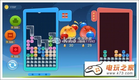模式介绍:游戏会自动匹配对抗玩家,我们每消除一行就会在对手消除区域下添加一个亮点,3个全亮时,再次消除会在对手消除区域底部加入一行不可消除的石块。