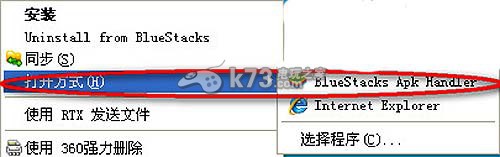 5.安装完后,右键点击我们前面下载在电脑上的游戏apk文件,选择打开方式选择“bluestacks”。